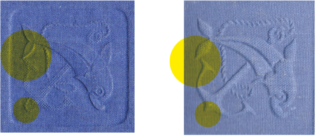 Para las cubiertas tanto en tela como en imitación a tela (guaflex azul), se hicieron dos gofrados, el primero es el mismo dibujo del símbolo-marca de la colección, y el segundo, un reediseño donde los elementos están más definidos y con cambios, como en el cabo, que ya no llega a la cruz del ancla, o las aletas del delfín, que sobrepasan la perpendicular del ancla.