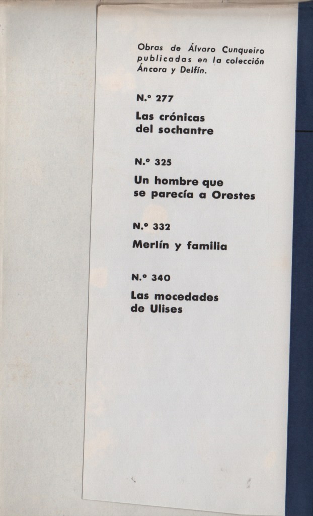 Ya he comentado en el inicio del artículo que la primera novela en gallego de Álvaro Cunqueiro es Merlín y familia editado en 1955 por la editorial Galaxia.