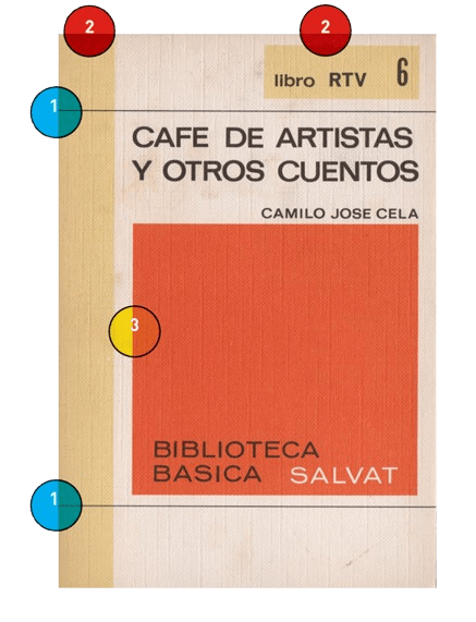La cubierta está impresa a tres tintas: negro para los textos —excepto “SALVAT”— y para dos líneas paralelas (1); crema para la contracubierta, una franja de 2 cm de ancho en la cubierta y un recuadro superior que incluye “libro RTV” y el número de la colección (2); y un tercer color para el reconocible cuadrilátero (3) —que no cuadrado—, que a muchos nos recordaba a un detalle de alguna de las composiciones de Piet Mondrian.