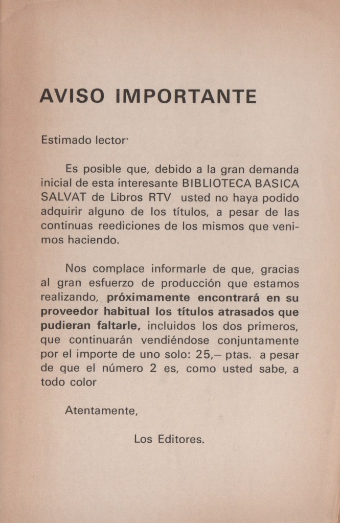 4.— Primera colección (1969–1971): comienza en 1969 con el número 1, impreso en Altamira Rotopress (Madrid), el volumen 2 a todo color, que se imprimió en Heraclio Fournier en papel couché, y el volumen 3 en Gráficas Estella (Navarra). Entre Altamira y Estella se repartieron la impresión de los 74 volúmenes de la colección “RTV Biblioteca Básica Salvat”. A partir del volumen 75 hasta el volumen 100, creo que sólo se imprimieron en Gráficas Estella—. El último título de la primera colección —volumen 100— se imprimió en 1971.